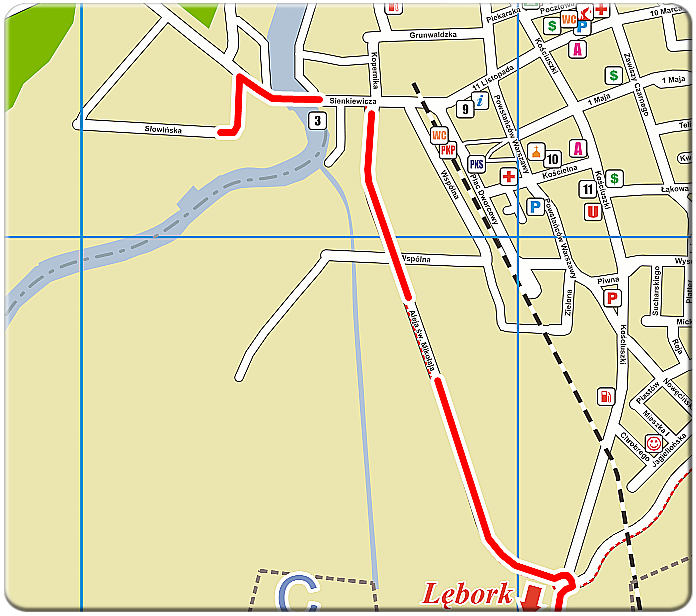 Przejeżdżamy przez długi most z latarniami, mijamy po lewej kemping "Rafael" i po około 50 metrach skręcamy w lewo na ulicę Słowińską.